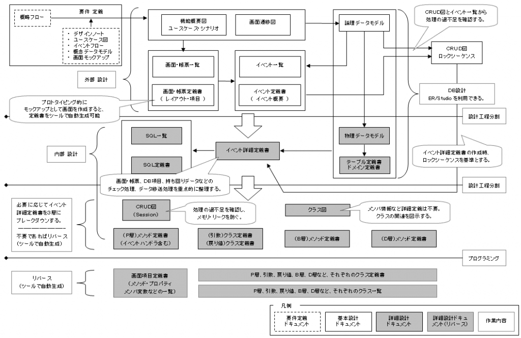 コレら非機能要件(システム・サイド)を、機能要件(業務サイド)の要となる「画面・帳票定義書」、「イベント定義書」とガッチャンコすることで、大規模プロジェクトのアプリケーションの実装フェーズが立ち上がります。