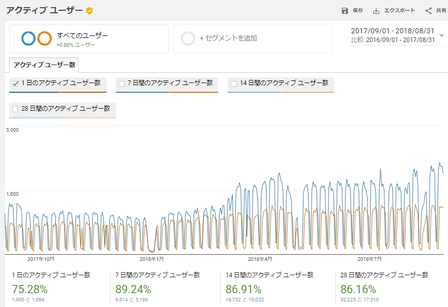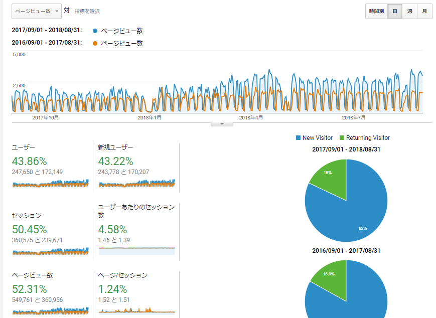 以下、前年比を「Google アナリティクス」を使用して分析してみましたが、今年から当ブログ投稿を定期的に行い始めて、更にPVが伸び始め、前年比で2倍ぐらいに伸びています。